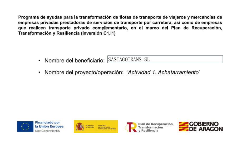 La empresa Sastagotrans ha sido beneficiaria de una ayuda para la Transformación de Flotas de Transporte en el marco del Plan de Recuperación, Transformación y Resiliencia (PRTR), financiado por la Unión Europea – NextGenerationEU.